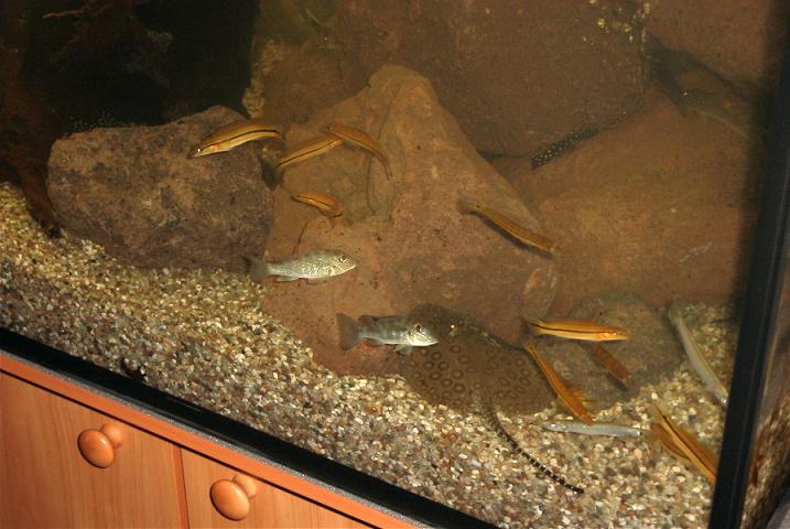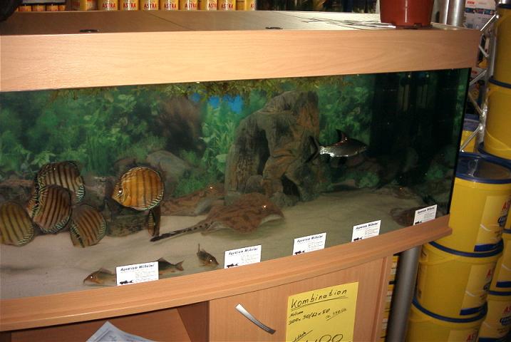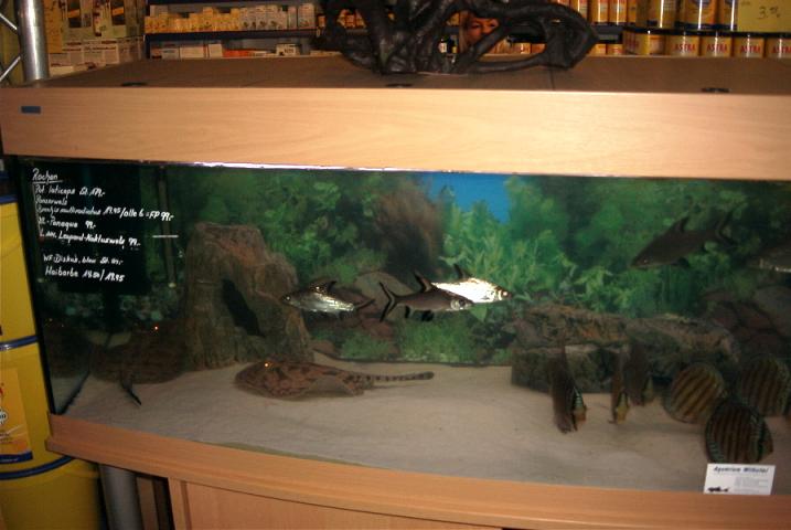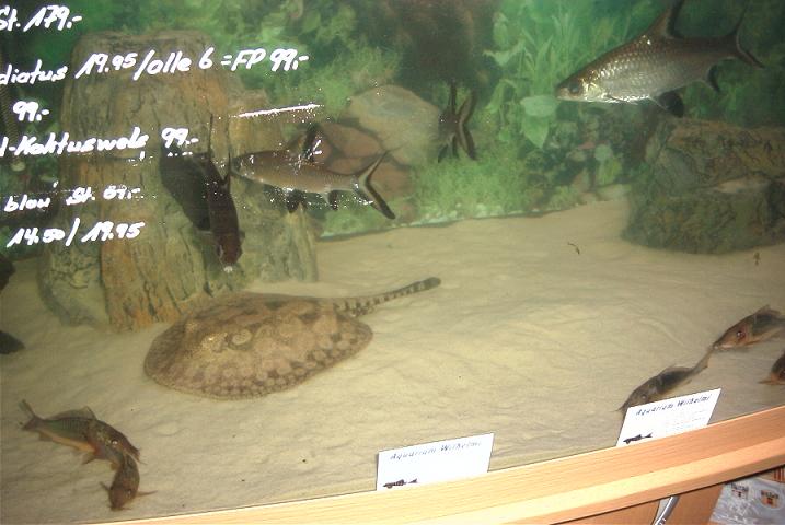 Direkt der erste auf meiner Runde,war der jenige der letztes Jahr mit seinem Amazonas Becken schon negativ aufgefallen war.Er zeigte in einem seiner Becken,ein ca. 35cm Perlenrochen Weibchen,ein 25cm Otorongo,ein ca. 25cm Schröderi Weibchen und ein 20-25cm Tigerrochen Weibchen.Das Perlenrochen Weibchen hat sich nicht ein mal von der Stelle bewegt.Das Otorongo und Schröderi Weibchen war sehr aktiv,und in einem annehmbaren zustand.Das Tigerrochen Weibchen hatte sehr viele offene Wunden an der Unterseite.Am verhalten sah man das es ihr sichtlich schmerzte,mit den offenen Wunden am Boden zu liegen.Auch das schwimmverhalten zeigte keine sichtliche Besserung.In einem anderem Becken stellte er das Flußsystem des Rio Trombetas aus Brasilien da.In dem zwischen Südamerikanischen Salmlern,Afrikanische Raubsalmler (Hepsetus Öde) schwammen.Das war dann so lächerlich das ich beschloß,nur noch raus hier.Der zweite auf meiner Runde,war ein Aquarium Geschäft,das zwar in einem trüben und übersetztem Becken eine Gruppe von fünf Potamotrygon Histrix zeigte.Die aber in einem sehr guten zustand waren.Der dritte wieder ein Händler,er zeigte ein Leo Pärschen,ein Scobina Pärschen und einen Motoro.Der ca. 35cm Leomann war so stark abgemagert,das man hätte meinen können die Beckenknochen durchstoßen gleich die Haut.Das ca. 30cm Leoweibchen sah leider auch nicht viel besser aus.Das Scobina Pärschen und der Motoro gingen gerade noch so.Der vierte und fast letzte auf meiner Runde war wie auch anders zu erwarten wieder ein Händler.Er zeigte ein Pärschen Potamotrygon Leopoldi Small Spotted,ein Rochenkenner konnte aber schnell erkennen das es sich hier um ein Pärschen Potamotrygon spec P14 gehandelt hat.Der P14 man war ca. 35cm und das Weibchen ca. 30cm.Beide waren in einem fast guten zustand,und hätten fast ohne bedenken für 1199 ? gekauft werden können.Der gleiche Händler zeigte noch einen ca. 20-25cm Leomann,der auch in einem fast guten zustand war.Den fast letzten Rochen sah ich nur durch Zufall.Es war ein ca. 10cm Motoro baby,das auch leider nur regungslos im Becken herumlag.Zugute letzt wurde noch ein ca. 15-20 Perlray Weibchen gezeigt,wo ich aber nicht 100% zu ordnen konnte wem die Becken gehören.Das Weibchen war mit unzähligen Uarus vergesellschaftet,die dem Rochenweibchen am Schwanz herum gefressen haben.